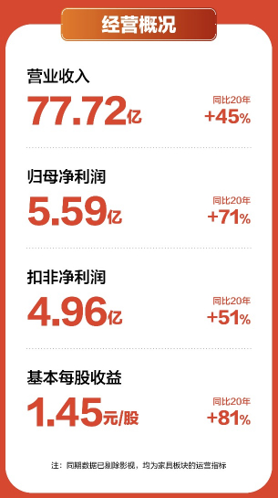 4月20日,喜临门的最新财报显示,2021年实现营业收入77.72亿元,同比增长38.21%,实现归属于上市公司股东的净利润5.59亿元,同比增长78.29%,实现归属于上市公司股东的扣除非经常性损益的净利润4.96亿元,同比增长58.19%。