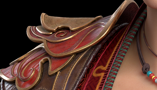 当然,我们在角色的设计上也尽显匠心。比如角色的皮肤材质与毛发都与真人非常接近,即便是放大多倍,也可以看出皮肤的精细和复杂,加上真实毛发的技术处理,更显得人物栩栩如生。无论是装饰用的皮革、内搭的缝线锁边、外衬的团花与羽饰都有经过非常复杂的设计与制作,不仅要在与真实材质的对比上达到以假乱真,在结合人物性格的同时,设计出符合现代审美的服装道具,也是重要的创作理念。