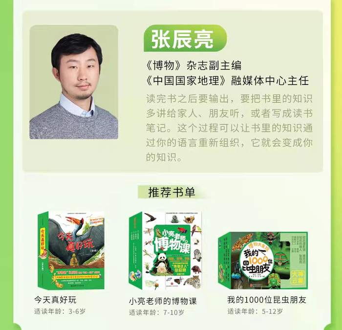 而被做成表情包走红网络的张辰亮,真实身份是科普作家、《博物》杂志副主编。他给孩子们介绍了一个读书的好方法:“读完书以后要多输出,要把书里的知识多讲给家人、朋友听,或者写成读书笔记。这个过程可以让书里的知识通过你的语言重新组织,它就会变成你的知识。”