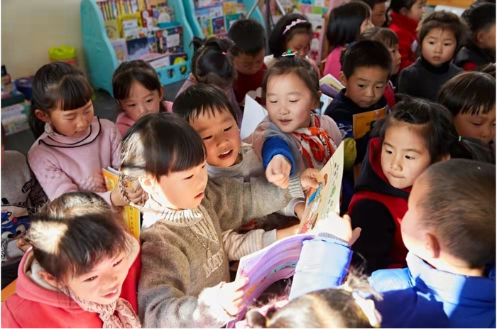 图说:年糕妈妈位于杭州千岛湖王阜乡幼儿园的绘本点,孩子们看到绘本眼睛发光。