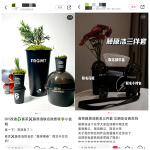 除了销售的火爆,在小红书、微博等平台,喜茶和藤原浩联名产品还引发了一轮灵感二创风潮。许多消费者在购买酷黑莓桑后,充分发挥灵感创意,将联名的黑色饮品杯子、包装袋、保温袋留下进行全方面地二次创作。如饮品杯被改装成了花瓶、笔筒,保温袋被改成了背包、纸巾盒等等,成为日常可循环使用的潮流单品。