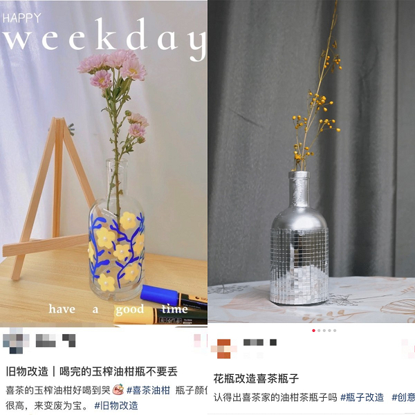 此外,这次二创风潮也体现了喜茶的环保理念。喜茶一直鼓励用户对包材二次利用,此前喜茶玻璃瓶、油柑瓶也都因为富有质感的造型、质量和实用性,受到用户的喜爱,引发灵感改造和重复利用。