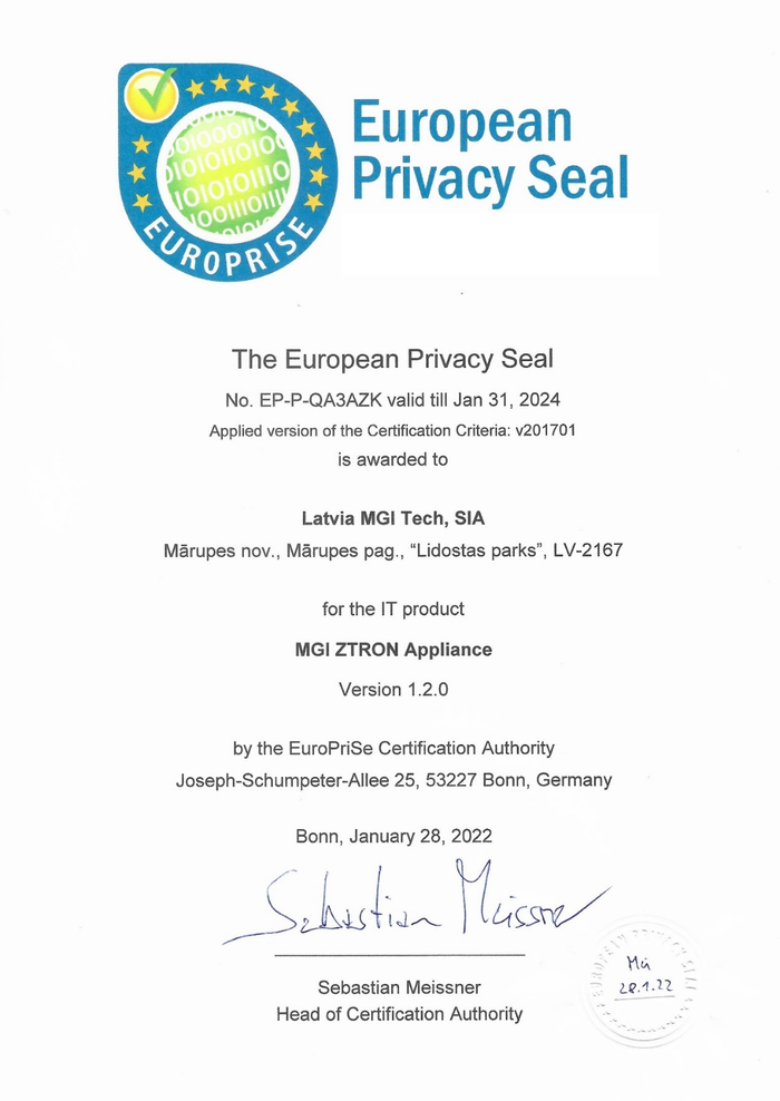 值得一提的是,近期欧洲隐私保护认证权威组织 EuroPriSe 向 ZTRON基因数据一体机授予了 European Privacy Seal证书,获得全球范围内最为严苛的欧盟GDPR 认证。历时一年半、历经层层审核,此次获证进一步验证了 ZTRON 基因数据中心一体机的隐私保护能力,为客户数据安全筑起一面隐私保护墙。