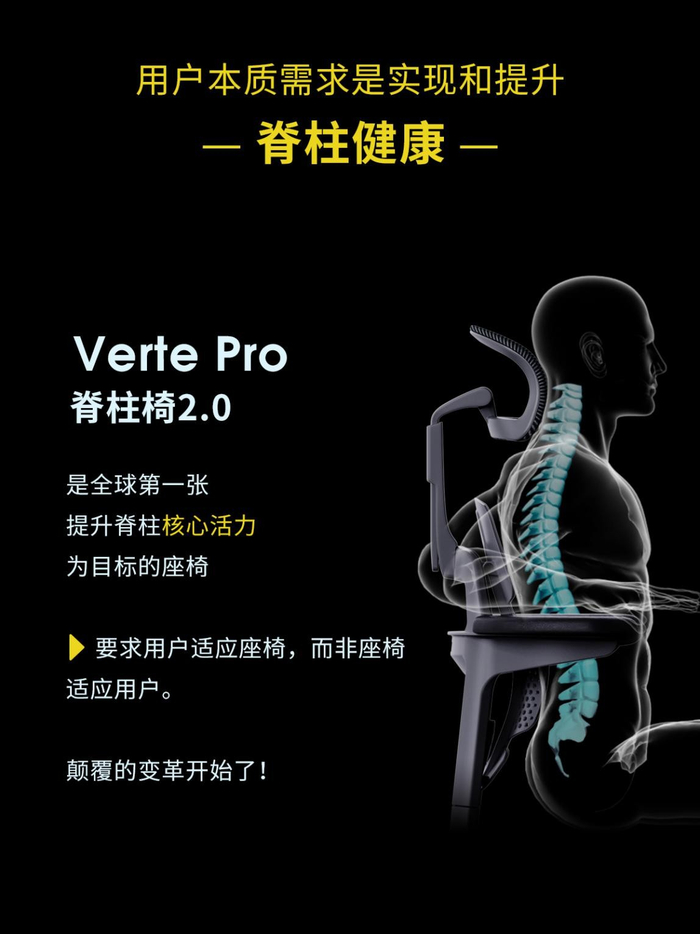 现代职场人面临最大的健康问题就是脊柱亚健康。据摩伽研发总监介绍,传统座椅以适应用户的所谓舒适坐姿为目标,但是摩伽研发团队则认为仅适应用户坐姿是绝对不够的,所谓的舒适坐姿甚至是脊柱病痛的最大根源。VertePro脊柱椅2.0采用了创新设计的核心四维Core4Fit™椅背,C型环抱式扶手,并深度打造了脊柱健康的三个医学级别的拉伸姿态,有效帮助用户恢复和提升脊柱活力,让身体在日常生活中,逐渐回归正确体态,从而改善脊柱亚健康。VertePro脊柱椅2.0是全球首张以脊柱核心系统活力健康提升为座椅设计标准的人体工学椅,基于脊柱椅1.0的丰富积累,有效地改善用户脊柱健康、提升脊柱核心系统活力。
