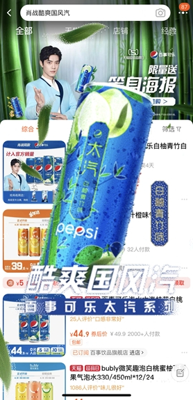 伴随着概念短片的强势引爆,百事可乐以天猫超级品牌日为关键抓手,凭借明星超级影响力,通过一系列创意策划击穿年轻用户群体:活动限定推出的百事可乐天猫超级品牌日专属国风套装,包含定制国风折扇、颇具收藏价值的代言人卷轴等肖战同款周边礼;特别策划上线的淘系站内创意互动,让“酷爽国风汽”席卷淘宝,搜索彩蛋【肖战酷爽国风汽】搜索量近5万次,在各大社交平台掀起粉丝狂欢;线下户外大屏的投放让“酷爽国风”霸屏九城,覆盖8000万+人流,成为粉丝热门打卡地。