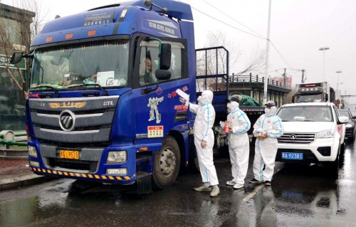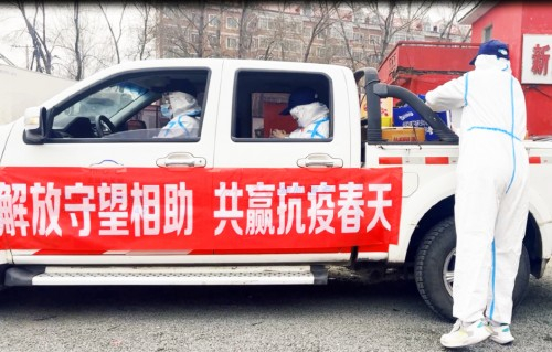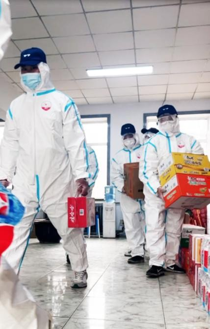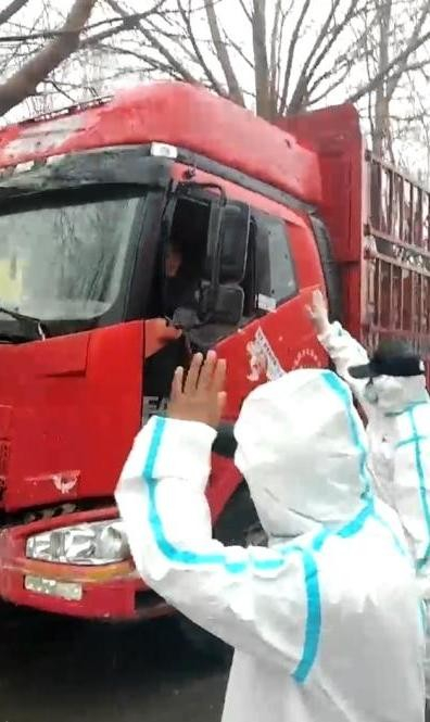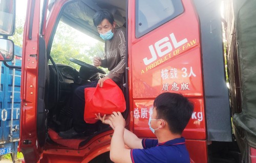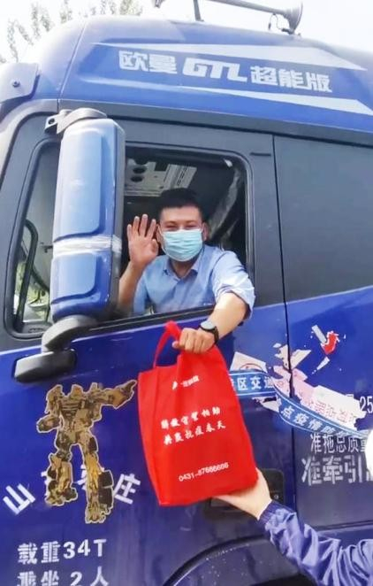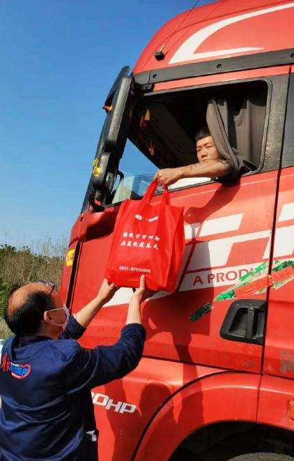 解放哈尔滨起迪服务站工作人员,先后到哈尔滨市香坊区瓦盆窑高速口、哈尔滨龙园菜市场、哈尔滨哈达批发市场,为在隔离区内滞留和车门贴封条的卡友送去生活物资。