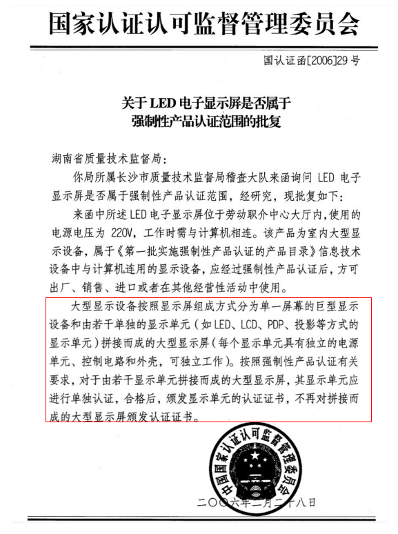 为此,对于LED显示屏、DLP/LCD拼接屏等拼装类的显示设备的CCC认证,2006年国家认监委曾就相关问题的释义回复中给出了解答: