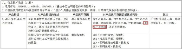 2020版目录中,值得注意的是:(1)大类概述之1条,将“仅在室外环境使用的设备”排除在认证范围之内。据此理解,“户外LED电子显示屏”不在CCC强制认证目录范围之内。(2)大类概述之5条,据此理解,包含音频系统的“LED(会议)一体机(电视)”不属于“与计算机连用的显示设备(0903)”类,而是归属于0806类实施认证。