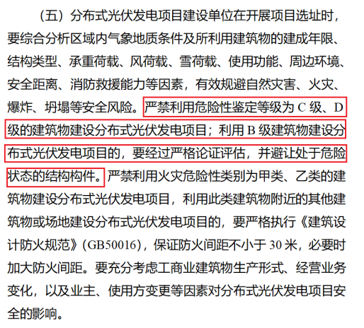 国家能源局综合司发布《关于加强分布式光伏发电安全工作的通知(征求意见稿)》中,其中在规划选址管理方面,尤其是对建筑结构安全性进行相关说明,明确规定:严禁利用危险性鉴定等级为C级、D级的建筑物建设分布式光伏发电项目;利用B级建筑物建设分布式光伏发电项目的,要经过严格论证评估,并避让处于危险状态的结构构件。