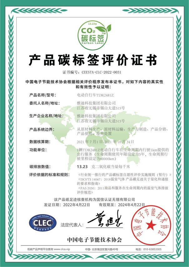 除了在科技创新上一马当先外,雅迪还将绿色出行基因深深融铸在其使命担当中,积极助力国家双碳政策落地。近期,雅迪荣获行业首张“产品碳标签评价“证书,是继雅迪冠能二代DE8获得“碳足迹”证书后,再度收获的权威认可。