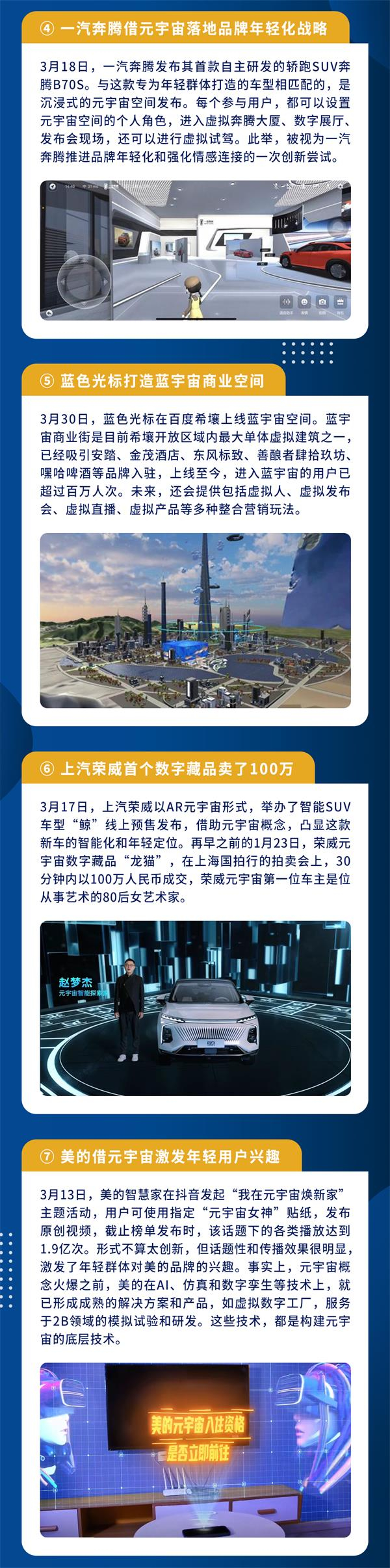 国内,基本也落棋在这两个方向上,另外就是元宇宙空间的发布会,3月是新品发布季,也是受疫情影响,车企、运动品牌、美妆、快消品等,把产品发布移师元宇宙空间,尽管体验和功能性,并不那么完美,成本也不低,但新鲜感,话题性,与产品希望凸显的科技感、智能化、年轻化等特性,结合的很贴切。