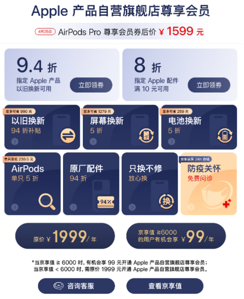 除了iPhone,MacBook Air、iPad Air、Apple Watch、AirPods Pro等爆款产品也都限时优惠,想要一站式配齐Apple全家桶的果粉千万不要错过。下单前推荐开通京东Apple产品自营店尊享会员,全年预计至高可省10000元,京享值大于6000就有机会以99元开通。温馨提示,即日起至4月25日还可预约99元开通尊享会员活动,成功预约的用户将有机会获得以99元/年开通Apple尊享会员的特价资格。