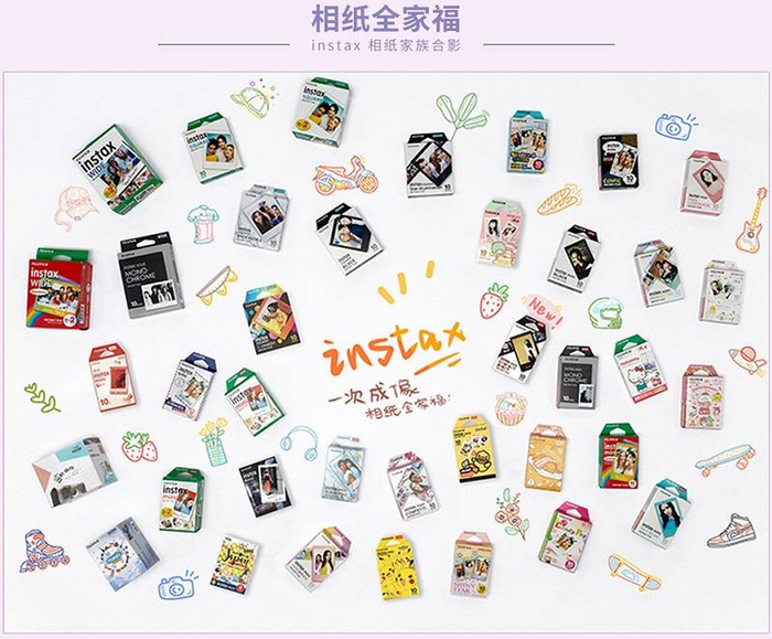 另外,为了让拍立得照片更具观赏性,富士instax在保持相纸质量的同时,还在相纸边框上花了很多小心思,除了常规的白边相纸,还有很多围绕IP、色彩、线条等元素制作的彩色边框,甚至还有充满神秘色彩的黑边相纸和星空相纸。