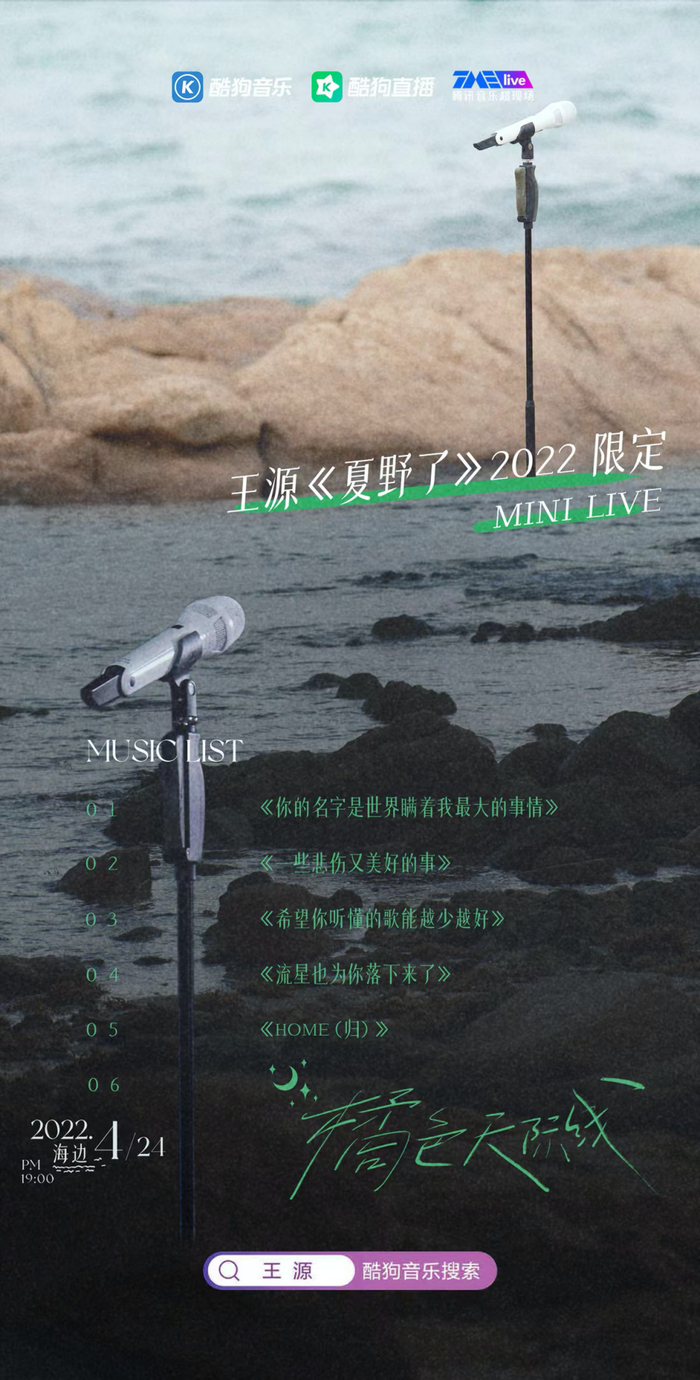 以礁石做舞台,伴随着阵阵海浪声,他在酷狗音乐舞台温柔吟唱!就在刚结束的4月24日晚,原创音乐人王源「橘色天际线」《夏野了》MINI LIVE如期登陆酷狗音乐TMElive舞台。
