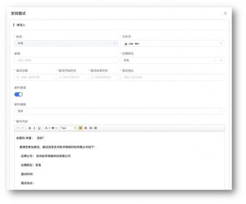 候选人信息管理:候选人offer流程自定义,审批通过后自动将offer发送至候选人邮箱。同时候选人可通过二维码填写预入职信息,方便HR进行一站式入职管理。