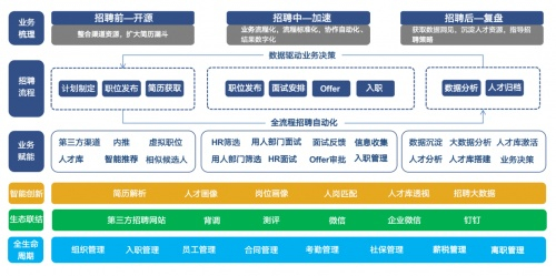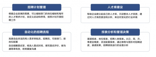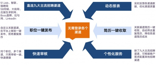 将招聘计划管理、招聘渠道管理、招聘流程管理、申请人跟踪、候选人关系管理和招聘结果分析结合到一个系统解决方案中,实现全渠道聚合管理,全流程可视化分析,全方位智能处理