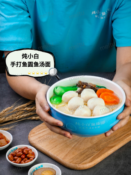 并且,经过炖小白的特色技术改良,店里的鱼汤面汤白汁浓,滴点成珠,辅以劲道滑溜的面条,再加上虾滑、鱼丸、鱼片等浇头,上桌前撒上葱花,吸溜一声,滑溜下肚。