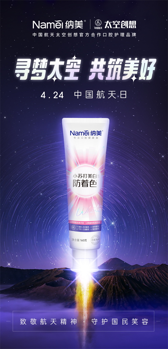 作为国民口腔护理品牌的纳美,不但肩负着守护国人口腔健康的使命,更肩负着传承民族精神、弘扬民族文化,助力文化科技复兴发展的重任。因此为弘扬航天精神,助力国货崛起,纳美与中国航天·太空创想和航天少年品牌正式达成合作,将航天精神的专注、严谨等等用在纳美的产品研发,品牌策略上,未来双方将从多方位、多角度来开展合作,让消费者切实感受到科技美化生活的力量。