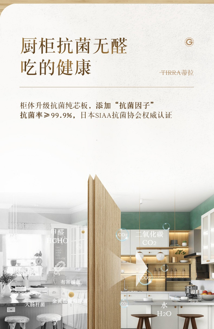 但从中我们不难发现一个矛盾点,原本最需要抗菌功能的厨柜本身的抗菌性能被弱化了,其他没有抗菌技术的家电或柜板的抗菌、杀菌功能却被强化了。