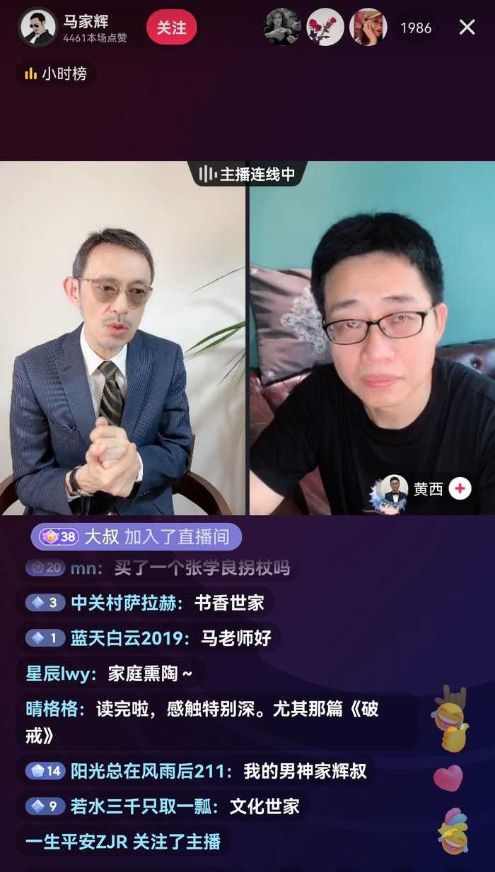 著名作家马家辉抖音直播连线脱口秀演员黄西,分享读书故事