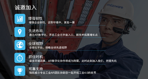 瑞欧威尔汽车行业AR数字化解决方案,以AR头戴计算机为平台,搭载数字化协作软件实现人、设备、数据、技术的无缝连接,赋能汽车研发、供应链、生产、运营、销售和服务等环节,帮助汽车企业提高组织远程数字化协同能力,复工保产,降本增效,提高盈利能力。在新产品研发、供应链协作、仓储运维、生产设备管理、线上销售等AR汽车行业应用场景上,AR数字化解决方案帮助汽车企业实现降本增效、流程优化,提升管理组织能力,数据可视化,构筑数字资产,缩短决策时间;最终达到韧性增长的目标。