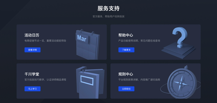 巨量千川官网设置的「服务支持」功能模块,让商家、达人们了解了平台投放价值后,提供一系列的服务支持,开启用户的投放之旅。巨量千川用户可以通过【活动日历】全面掌握电商促销节点,提前获悉电商促销活动预告;并可在【帮助中心】详细了解产品功能使用说明,在【千川学堂】则提供更多的投放技巧教学“干货”;在【规则中心】及时把控平台规则政策,让用户的投放更精准、高效。