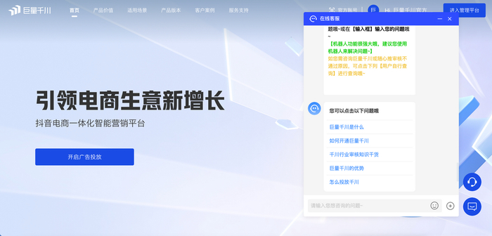 巨量千川官方网站的上线,将为商家、达人们搭建一个全新的电商营销“服务阵地”,提供全新电商广告投放全链路工具与综合性指导 ,助力商家实现高效投放,促进抖音电商生意持续增长。巨量千川用户还可通过官网首页右侧的客服入口,直接进行营销咨询,省时高效。
