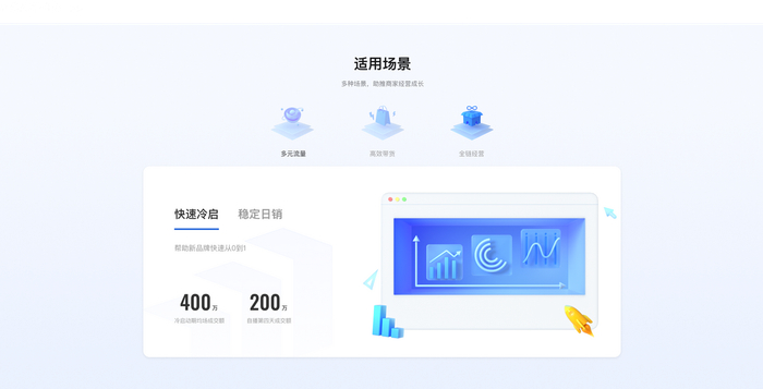 对于巨量千川用户而言,无论是提升品牌声量、带动GMV,还是长效经营,不同的电商场景,需要不同的营销策略,更需要更具个性化的流量、内容等营销方案的支撑。官方网站打造的「适用场景」功能模块,展示在多元流量、高效带货、全链经营等不同营销场景下,巨量千川的数据成果,提供给商家方案参考,助推商家经营成长。