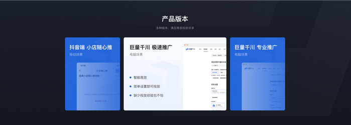 巨量千川官网打通平台渠道,通过「产品版本」功能模块,将抖音端【小店随心推】、PC端【极速推广】、PC端【专业推广】三个版本聚合于同一页面内,让商家、达人用户一目了然,根据自身实际操作能力,选择对应版本,满足商家投放诉求。