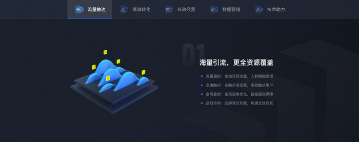 目前商家、MCN/达人等处在竞争愈发激烈的电商营销环境之中,平台所能提供的营销价值成为大家最为关注的核心。瞄准这一需求,巨量千川官网专门设置「产品价值」模块,借助平台的流量触达、高效转化、长效经营、数据营销、技术助力等优势,帮助商家、达人们快速详细了解平台所带来的营销价值。