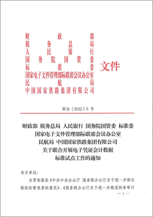 为贯彻落实《中共中央办公厅 国务院办公厅关于进一步深化税收征管改革的意见》、《国务院办公厅关于进一步规范财务审计秩序 促进注册会计师行业健康发展的意见》(国办发〔2021〕30 号)、《国务院办公厅关于改革完善中央财政科研经费管理的若干意见》(国办发〔2021〕32 号)的工作部署,按照《会计改革与发展“十四五”规划纲要》推进会计数字化转型的要求,财政部、税务总局、人民银行、国务院国资委、标准委、国家电子文件管理部际联席会议办公室(密码局)、民航局、中国国家铁路集团有限公司联合组织开展电子凭证会计数据标准试点工作。