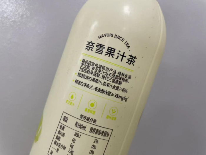 记者看到几款果汁茶的瓶身都印有“罗汉果汁代替糖,真果真茶真低糖”字样,明确突出产品添加的果汁含量≥40%。除了真实果汁外,几款饮品的茶底也都有明确标注,如白芽奇兰、闽南乌龙、金色山脉等,茶多酚含量从≥200mg/kg到≥400mg/kg不等。较市场同类产品原料标准确实会更高。