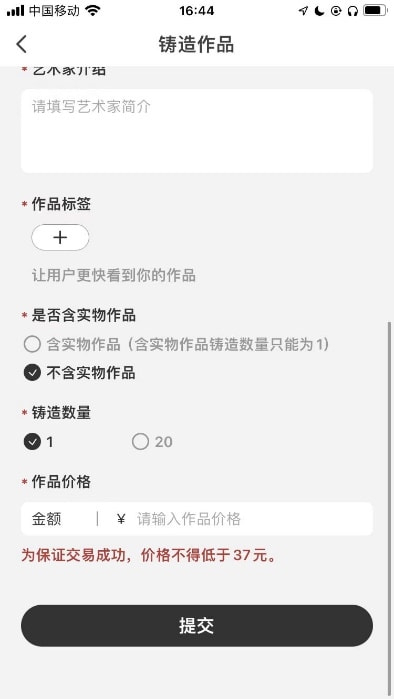 (可以选择图片、视频、3D的不同格式,编辑个酷炫吊炸天的艺术家简介和作品简介,久财大帝就毕业于加里敦大学视觉传达专业)
