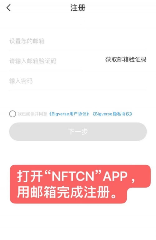第一步:打开“NFTCN”APP,注册会员,完善个人信息。目前只能用个人邮箱,在注册前一定要阅读好用户协议,保证自己的权益。