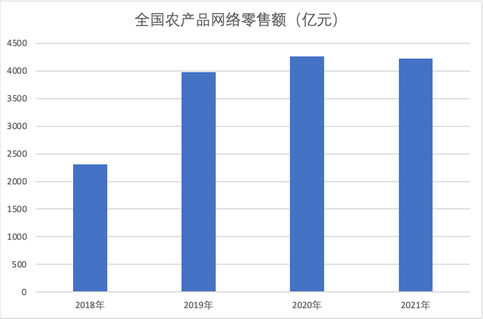 4月,中央网信办、农业农村部、国家发展改革委、工业和信息化部、国家乡村振兴局联合印发《2022年数字乡村发展工作要点》。《工作要点》明确指出:到2022年底,农产品电商网络零售额将突破4300亿元。