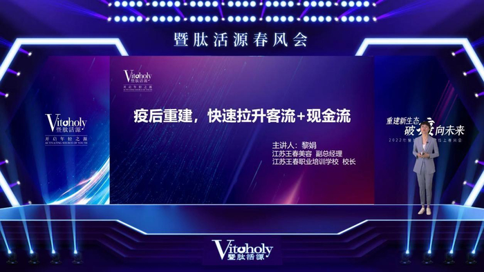 暨肽活源品牌高管邹茜女士提出美塑之道在于“精于研发·卓越科技·高贵品质”的核心理念,深入强调了科研创新在暨肽活源品牌建设中的重要地位。暨肽活源品牌高管邹雪娇女士则深入剖析了后疫情时代下的美业经营环境变化,提出“业绩金三角”的实战方法论,帮助门店增加有效顾客数,让现有的有效顾客买的更多,回归到门店经营的本质,打造暨肽活源品牌新生态。