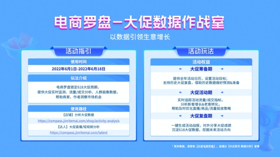 抖音618好物节的服务机制也实现了从启动前到结束后的全流程覆盖,为商家与达人的合作、经营以及消费者决策提供保障。例如618大促必备的数据助手——抖音电商罗盘 ,能够帮助商家达人们从大促筹备、大促爆发到大促复盘同屏跟踪,全周期地看清大促数据,洞察市场机会。其中包括对历史大促对比复盘、行业热门机会挖掘、粉丝画像洞察;爆发期间活动拉新效果分析及目标进度的追踪;并最终对货品效率、大促流量、商品成交、粉丝分析等方面的全面复盘,帮助商家与达人各自做好科学总结与改进,为下一次大促活动不断提供更具自身特色的“数据指南”。