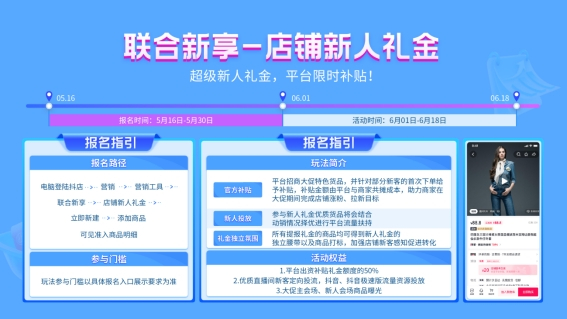 玩法第二弹:拉新。 作为本次活动不容错过的一大亮点,拉新板块也得到了抖音618好物节各方面资源的大力倾斜。其中包括限时补贴的“店铺新人礼金” ,该玩法主要针对部分店铺首次下单的新客给予补贴,助力商家在大促期间完成店铺涨粉及拉新的目标。同时,参与新人礼金的优质直播间将向新客定向投流,获得更多抖音、抖音极速版流量资源。最后,大促主会场及新人会场商品曝光的双重加持,以更多的露出机会和优越资源位为店铺拉新能力加码助力。