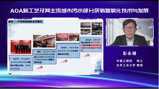 在发布会上,彭永臻院士围绕AOA新技术研发及校企联合技术转化成果进行重点介绍。为解决限制城市污水处理发展关键瓶颈问题,彭永臻院士团队自2012年率先发现后置内源反硝化现象,于2018年首次公开污泥双回流-AOA技术,在国际脱氮除磷技术领域作出突出贡献。同时,彭院士团队积极探索产学研用创新合作模式,推动科技成果转化,与北控水务联合开展AOA、短程反硝化、厌氧氨氧化等多项新技术应用试验,技术水平在国内外均处于领先地位。