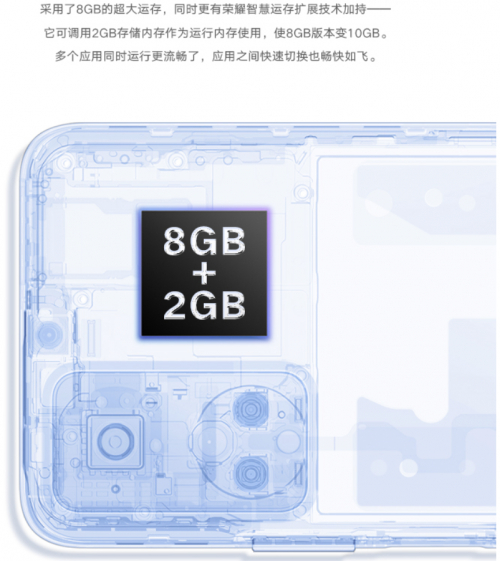 荣耀Play6TPro拥有8GB超大运存,配合全系智慧运存扩展可扩展为10GB运存,此外荣耀自研压缩技术让这扩展的2GB在使用体验上可以等效6GB效果,有效提升App冷启动速度,在开多个应用运行的同时,应用之间也可轻松实现快速切换,充分保障了后台应用运行的保活率。
