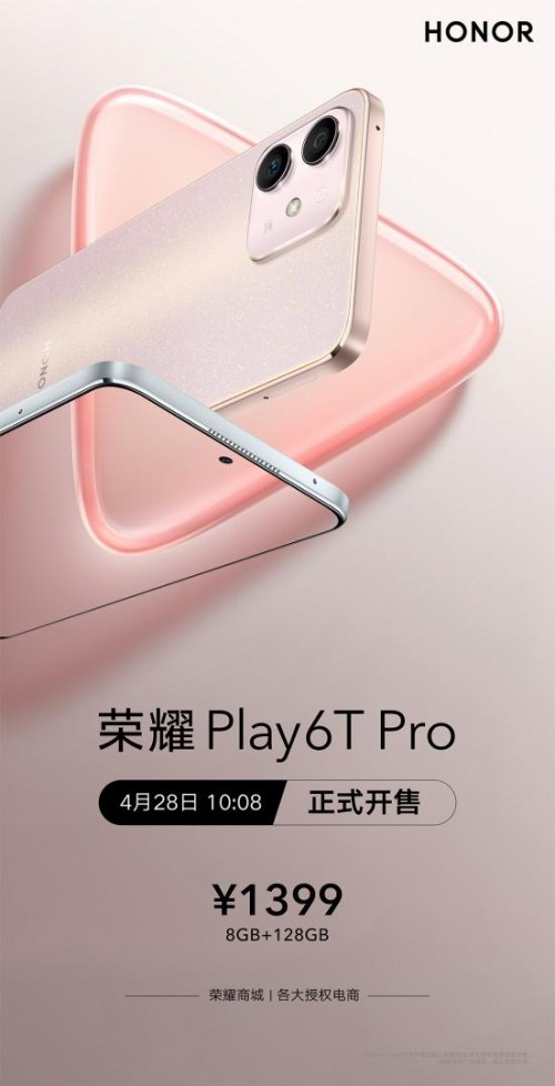 4月28日10 : 08,荣耀Play6TPro 8+128GB版本首销开启,售价1399元,配备40W超级快充、6.7英寸高刷护眼大屏、5G双卡双待、4800万高清影像等,更友好的价格,更实用的配置,为用户带来高性价比的5G大内存体验。