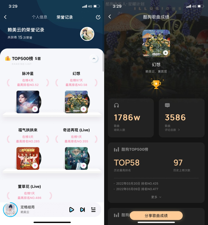 作为一名歌手,赖美云从未停止对音乐风格的探索。据资料显示,其在酷狗音乐平台上获得了较高的人气,其中歌曲《幻想》收听人数1786万,97次登上酷狗TOP500榜,受到了众多网友的喜爱。这些成绩背后除了小七个人的努力,也离不开其经纪公司齐鼓文化的助力。齐鼓文化,是酷狗音乐旗下的厂牌,有着酷狗音乐与酷狗直播作为平台依托。