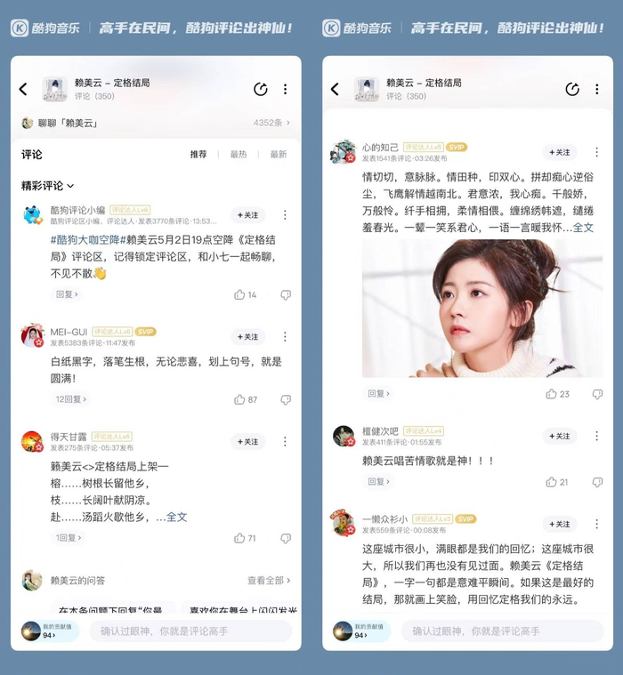 无论你是用声音去追逐自己梦想的音乐人,还是喜欢听不同曲风音乐的普通听众,都可以在酷狗音乐找到自己的“领地”。那么此刻,如果你也想到了那个最熟悉的陌生人,不妨上酷狗音乐搜索赖美云,在《定格结局》中找到你的独家记忆,小七还将在5月2日空降酷狗音乐《定格结局》歌曲评论区,与大家一起互动,敬请期待哦。