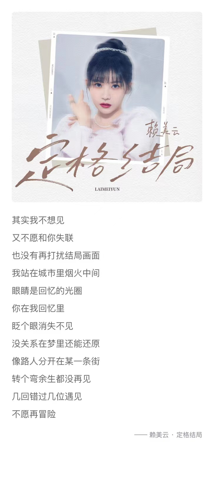 就《定格结局》的情歌表达这个话题,赖美云也在酷狗音乐电台节目《打歌请就位》中表达了自己的看法,“漫长的人生里啊,我们总不可避免地遇见以为会永远携手走下去的伙伴,到头我们却像偶遇的路人一般,在街角分开,汇入苍茫人海,再也不见”。小七在节目中也读了一段歌词,“其实我不想见又不愿和你失联,也没有再打扰结局画面,我站在城市里烟火中间,眼睛是回忆的光圈”,希望大家能从这首歌中,细细品味那份属于自己专属的独家回忆。