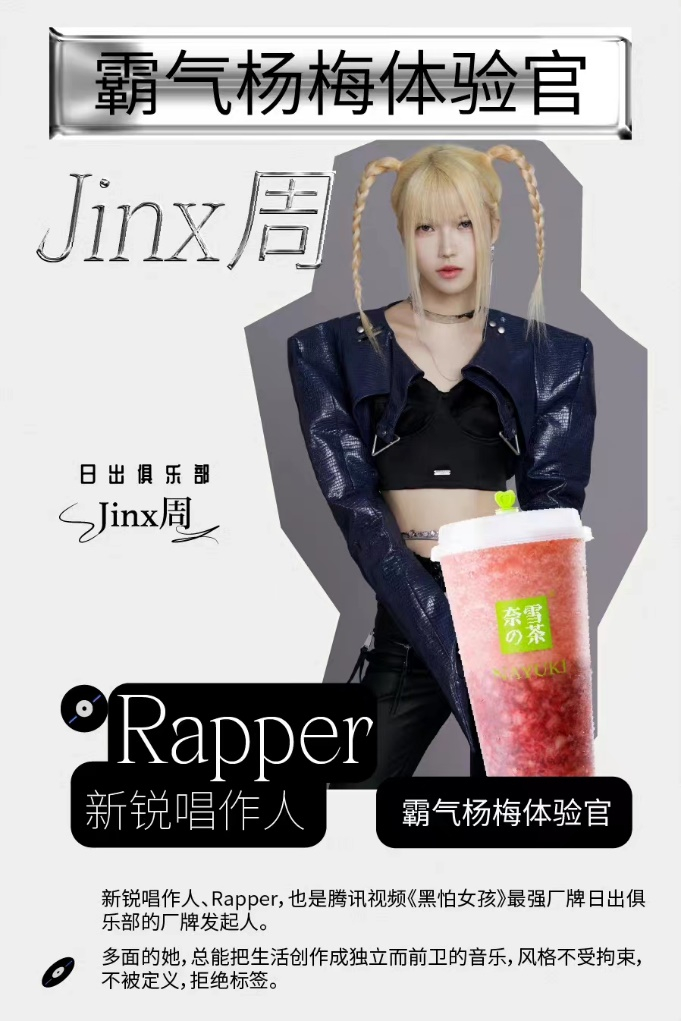 作为杨梅鲜果茶风潮的开创者,奈雪「霸气杨梅」系列坚持精选当季爆汁杨梅、颗颗手工去核,连续7年升级回归,缔造行业标杆。有着同样的坚持态度,作为新锐唱作人、拥有腾讯视频《黑怕女孩》最强厂牌日出俱乐部厂牌发起人光环的Jinx周,用实力诠释说唱魅力,唱饶舌时霸气外露,作品里张扬着对人生的态度,与奈雪用心坚守「霸气杨梅」品质7年的产品精神深度契合。
