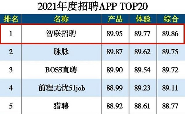 智联招聘全力做政府稳就业、稳经济的得力抓手,也通过努力不断收获行业与用户的认可。在艾媒咨询“2022年中国最常使用的招聘平台调查”中,62.1%的求职者选择智联招聘,使用比例高居TOP1;在《互联网周刊》等权威机构发起的“2021年度招聘APP”评选中,智联招聘以更高的综合评分位居榜首。