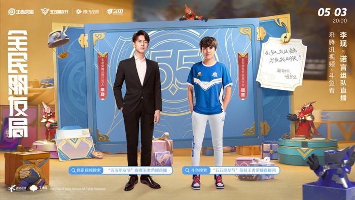 今年,《王者荣耀》官方首次将五五开黑节全新升级为五五朋友节,主打社交主题。每年斗鱼都是游戏官方非常重要的合作伙伴,今年也不例外,斗鱼在五一假期狂欢节里,邀请诸多人气主播、明星艺人给大家带来丰富有趣的直播内容和福利玩法。5月1日DBL揭幕表演赛;5月2日峡谷开黑日,主播1小时开黑带粉;5月3日“国民老公”李现空降斗鱼与eStarPro诺言激情开黑,“现”在来一局;5月4日“王者派对不打烊”专场,王者主播娱乐主播将跨区联动搞“联谊”;5月5日骚白开黑专场,骚白将携手神秘嘉宾欢乐五排。4月27日-5月10日活动期间,点亮五五朋友节朋友圈,即有机会瓜分百万现金红包、嬴取游戏典藏手办。