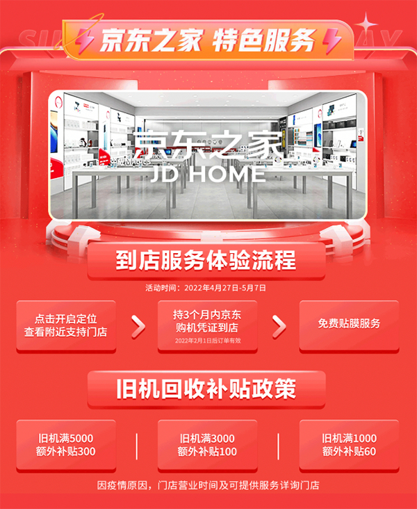 为了给大家提供更好的购机体验,只要是在京东购买的手机,持3个月内的购机凭证到京东之家门店,即可享受免费贴膜服务。在京东之家购买手机时,参与以旧换新,还可享受至高300元补贴;手机出现故障,还有原装电池更换、原装屏幕更换、原装摄像头更换等上门服务,一站式为用户服务。