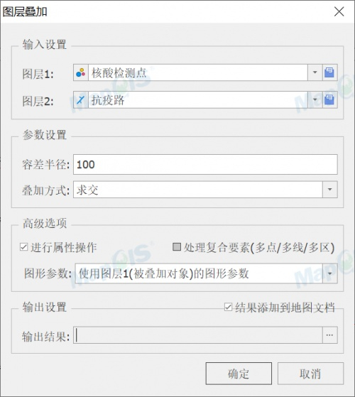2)点击叠加分析,在图层叠加框中设置输入参数(图层1的类型决定了结果图层的类型)、参数设置及输出设置。