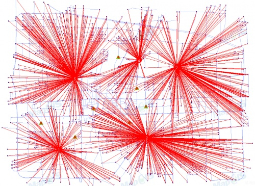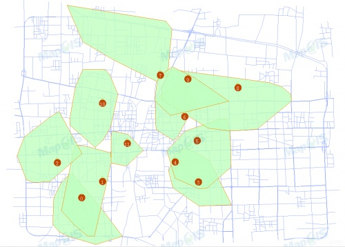 4)查询服务范围(根据各中心的供应量和限度等属性和各站点的需求信息,找到并标识出各供应地的服务范围,包括服务面积和服务距离)